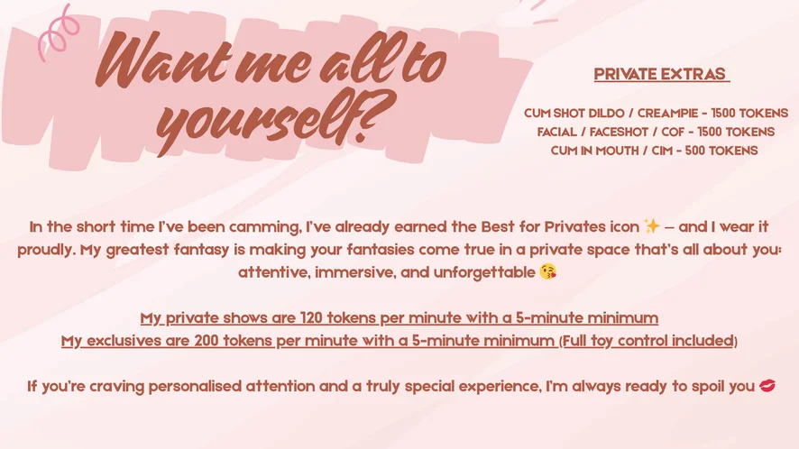 قضيب صناعي أو هزاز, وضعية الكلب, رقص مثير, نايلون, دش, رقص التعري, تقييم الزبر, فتيشية القدم, إهانة, كعوب عالية, صفع, صدر عارٍ, ألعاب حلمة الصدر, مص, رقص التويرك, عرض زيت, ألعاب جنسية, جلوس على الوجه, قذف على الوجه, بلع حتى الرغبة في القيء, فاضح جدًا, حلق عميق, نطر كساس, عاشقات, ألعاب شرجية